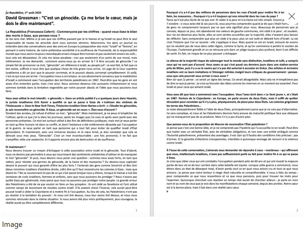 Trouvée sur les réseaux, je publie ici une réaction palestinienne à l’interview donnée par David Grossman au quotidien italien « la Repubblica » . Dont on trouvera également le fac-similé ci-dessous.